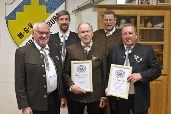 Der Innkreis-Sängerbund entsandte Benno Rummel und Barbara Noichl, um zwei seltene Ehrungen vorzunehmen. Für 60 Jahre aktiven Chorgesanges gratulierten sie Anton Fellner und Sebastian Unker mit der Ehrenurkunde und der Goldenen Lyra. Ehrendirigent Anton Fellner leitete den Chor über 32 Jahre. Musikikone Sebastian Unker sprang bei Bedarf immer wieder als dessen Stellvertreter ein.